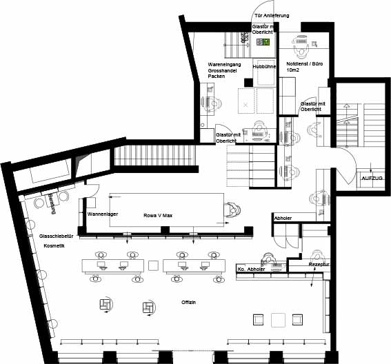 Leistung: Neueinrichtung 3 geschoßiger Grundriss, vorher Umzug der bestehenden Apotheke in eine