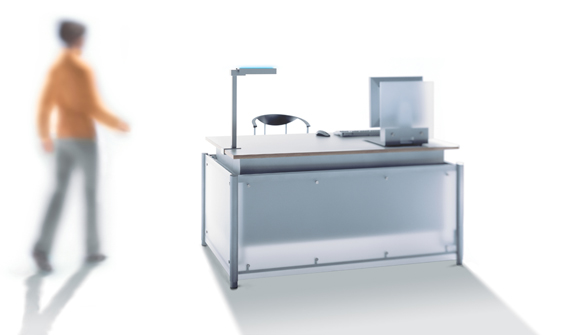 Die Theke ist per Knopfdruck elektrohydraulisch in der Höhe von Sitzhöhe auf Stehhöhe stufenlos zu verstellen.