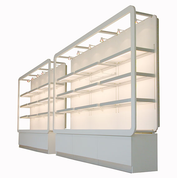 Leistung: Entwicklung eines erweiterbaren Regalsystems, beleuchtete Fachböden mit satinierten